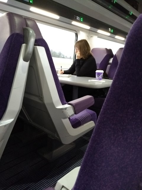 reads his newspaper, folds up the trash.We turn inland. A train Belfast bound